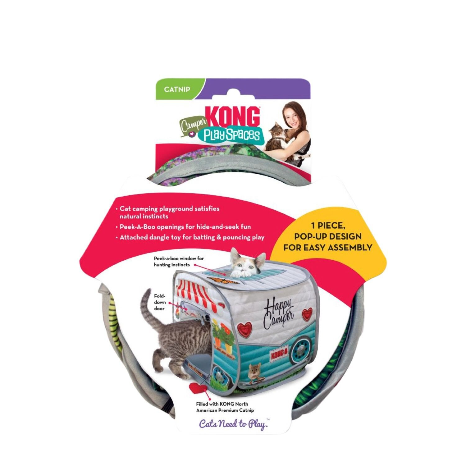 La fenêtre, la porte et le toit ouvrant permettent de jouer à cache-cache tout en offrant un exutoire instinctif. Le jouet suspendu incite au jeu, tandis que l’herbe à chat KONG nord-américaine de qualité supérieure, placée à l’intérieur du jouet, prolonge l’engagement. La conception monobloc et flexible permet un assemblage et un stockage faciles.